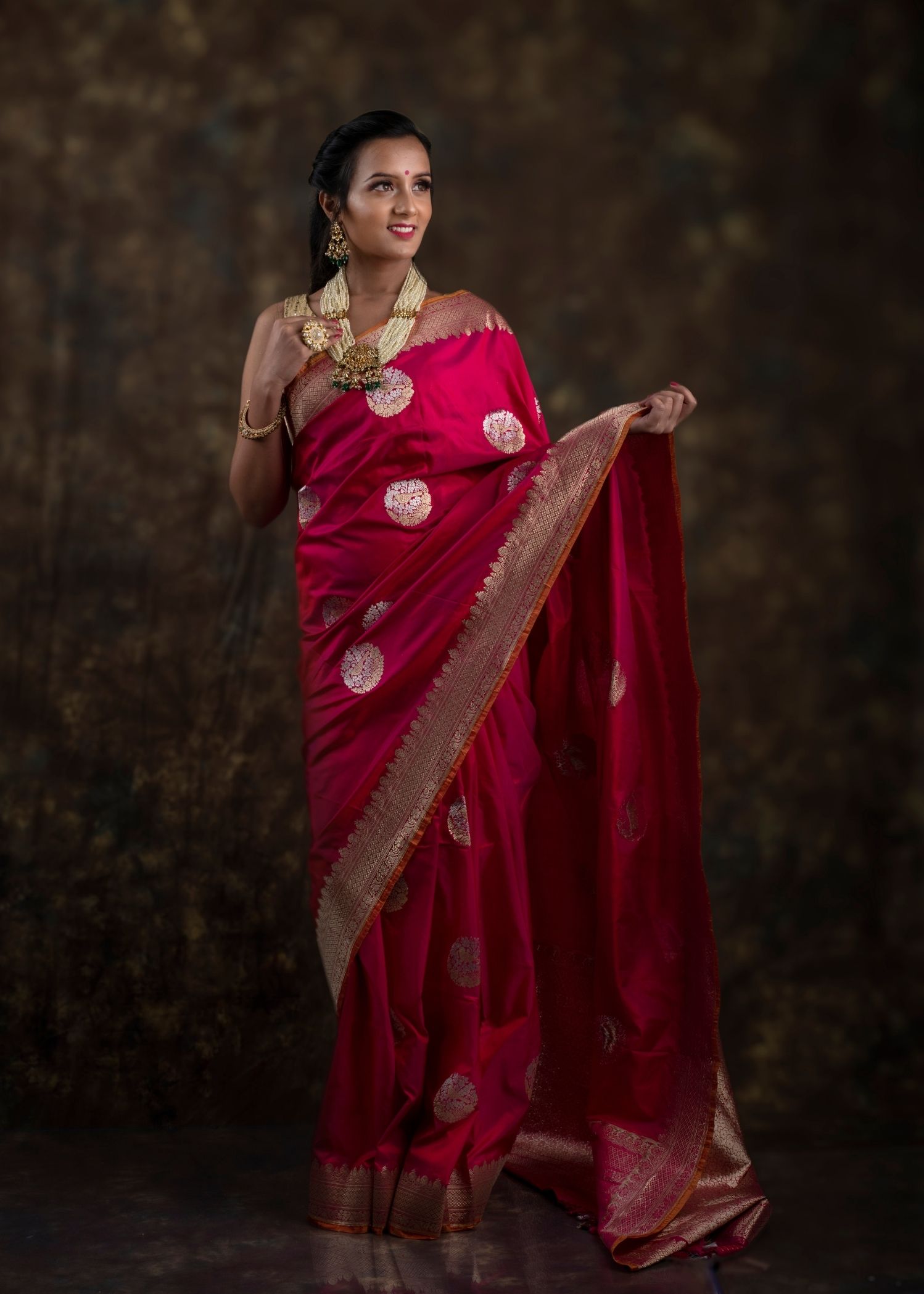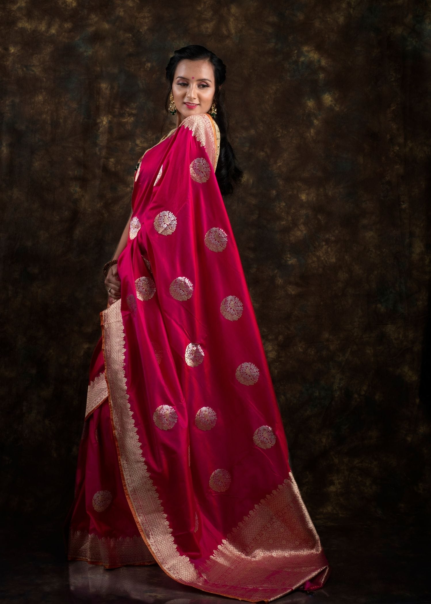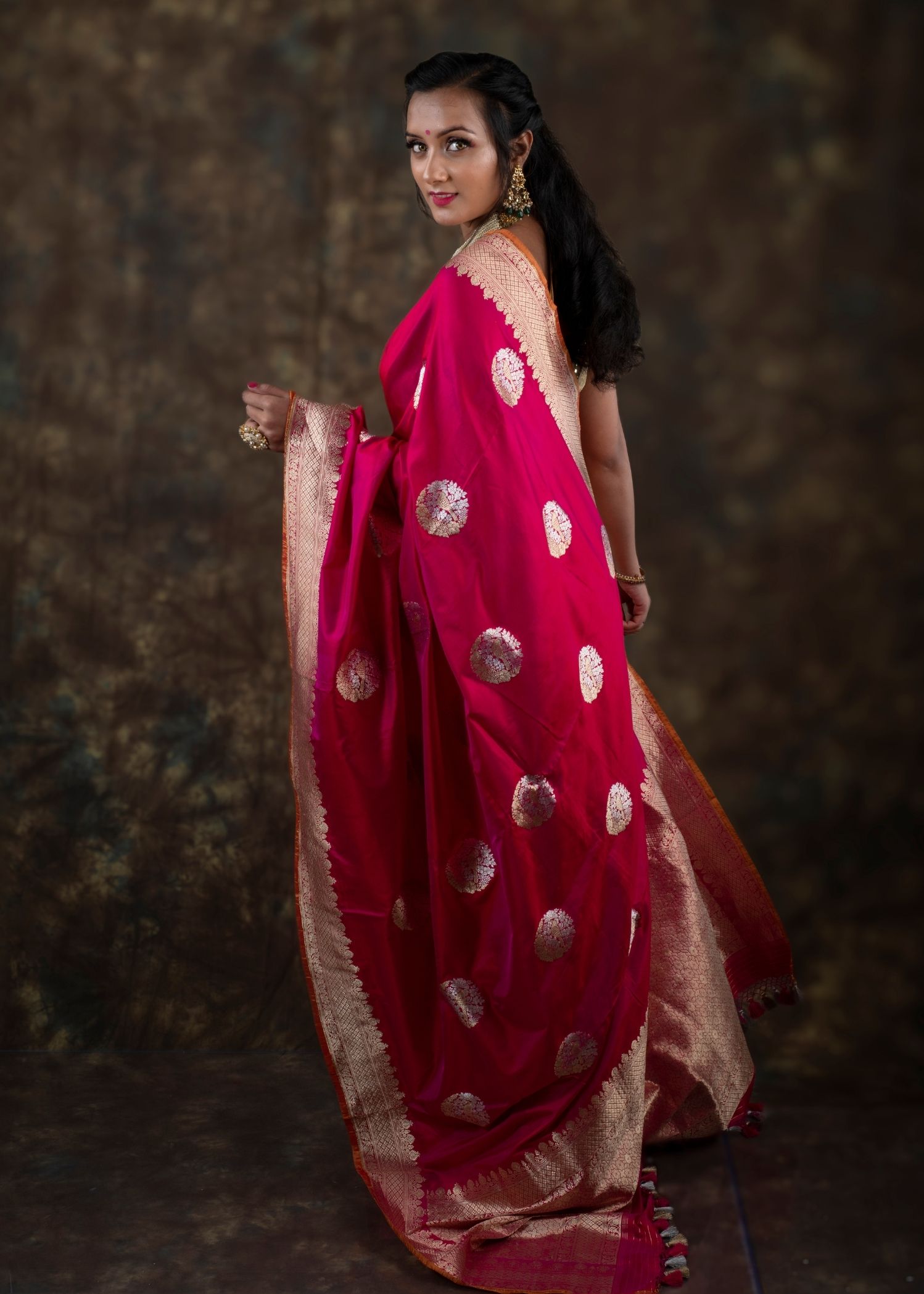 Be the first to review “Dark Pink Yellow Dual Tone Pure Katan Silk Banarasi Saree”
