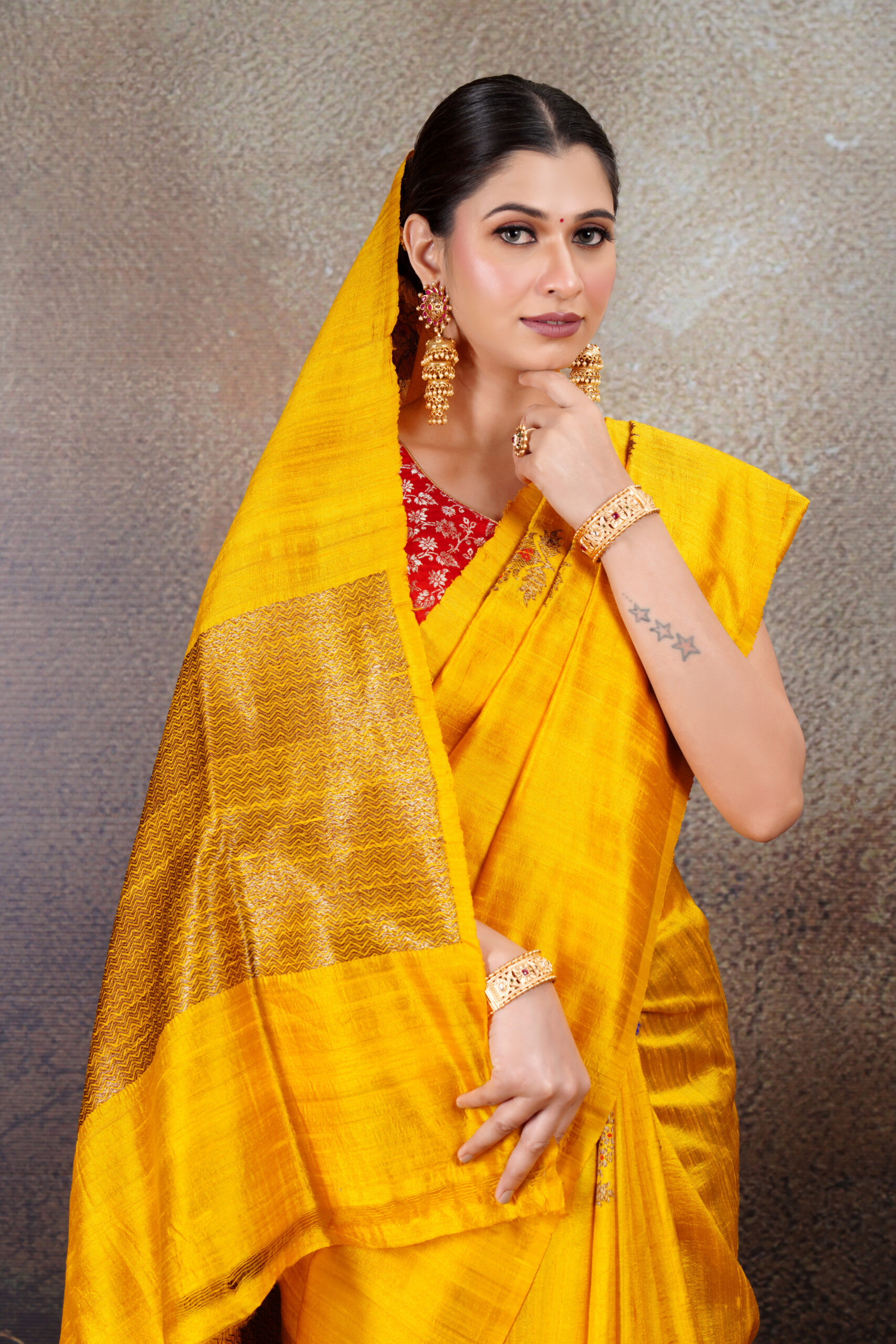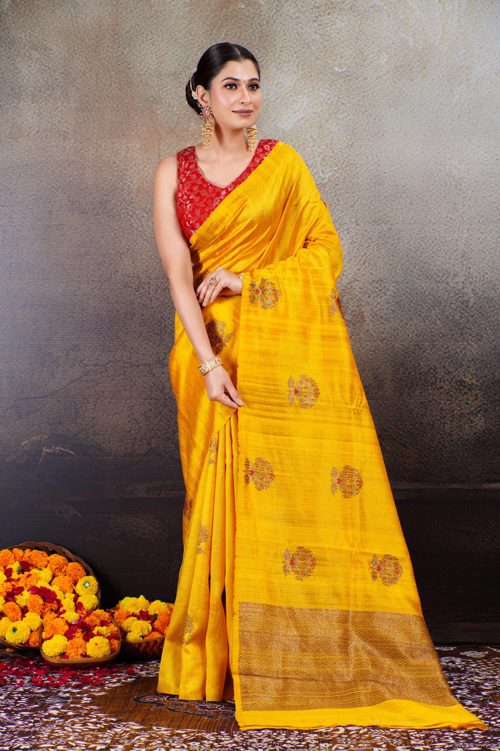 The saree is adorned with exquisite Kadhua-woven buta motifs, crafted using antique zari, creating a muted golden shimmer that perfectly complements the richness of haldi yellow. Each buta is further enhanced with delicate red Meenakari detailing, adding depth, color, and a touch of traditional artistry that makes the saree truly special.