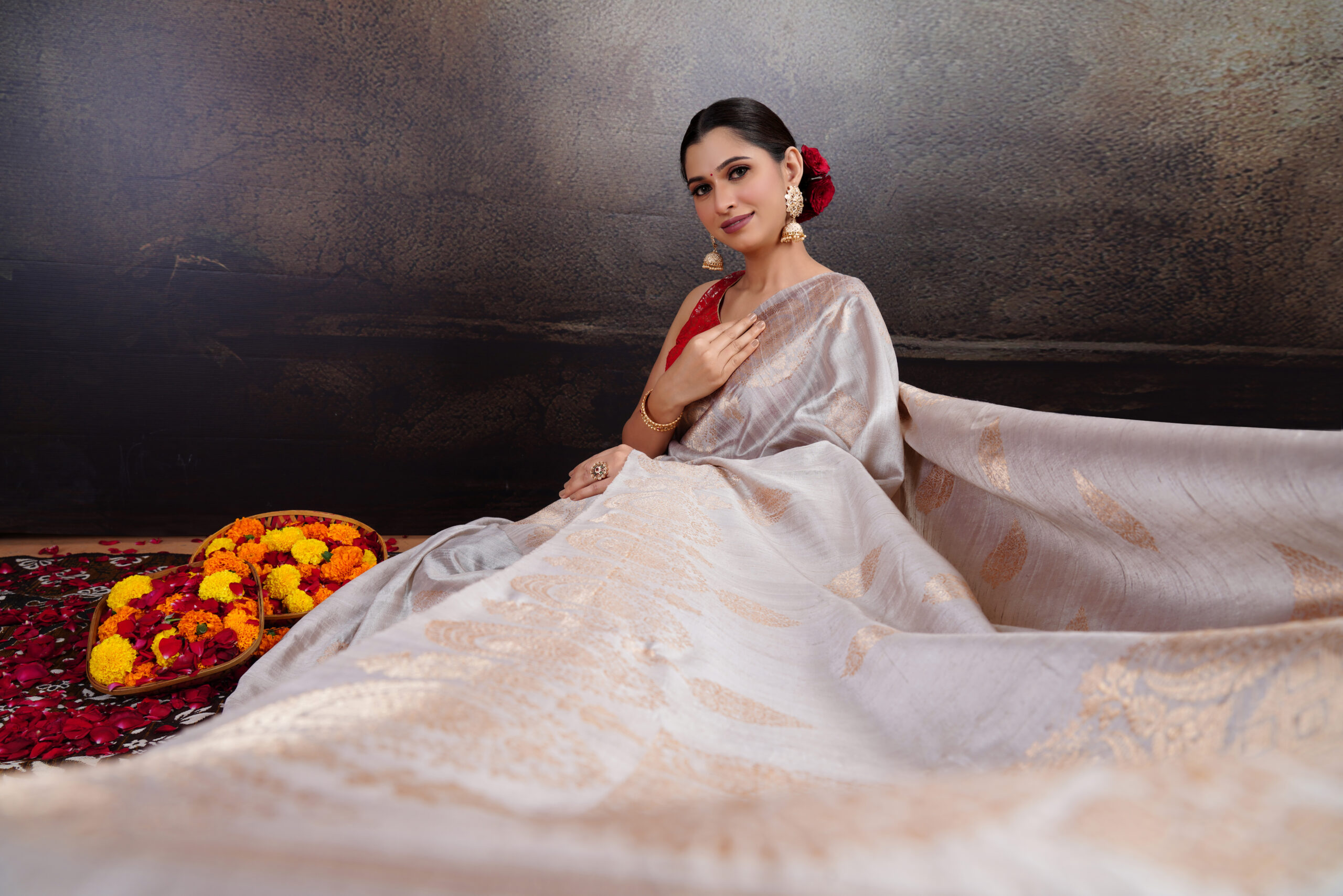 - Rose gold zari Kadhua buta and border for subtle luxury