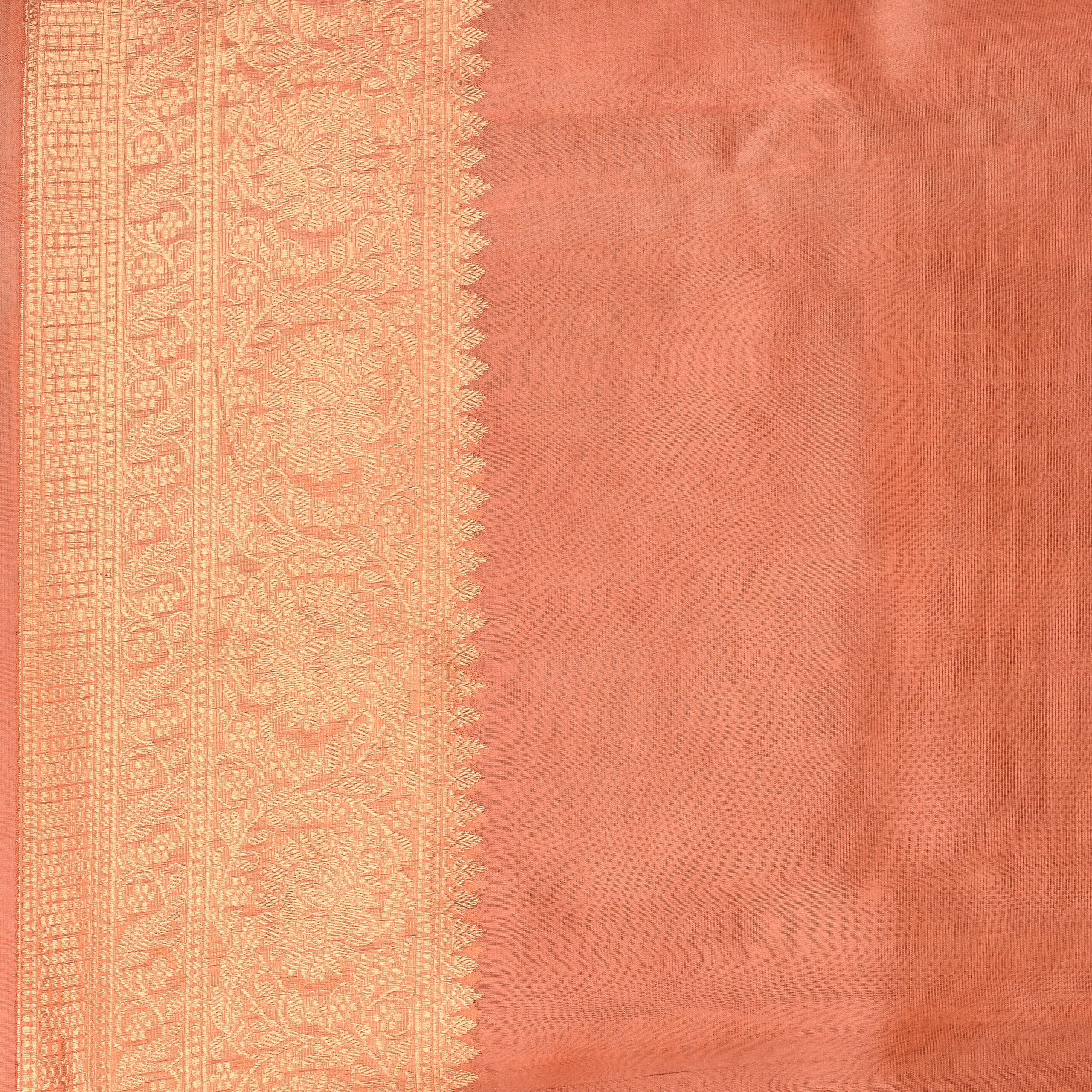 A whisper of tradition, a touch of luxury. This exquisite saree is handwoven in pure Kora silk, known for its sheer, gossamer-like texture and timeless elegance. The delicate peach hue lends an ethereal charm, making it perfect for both day and evening occasions.